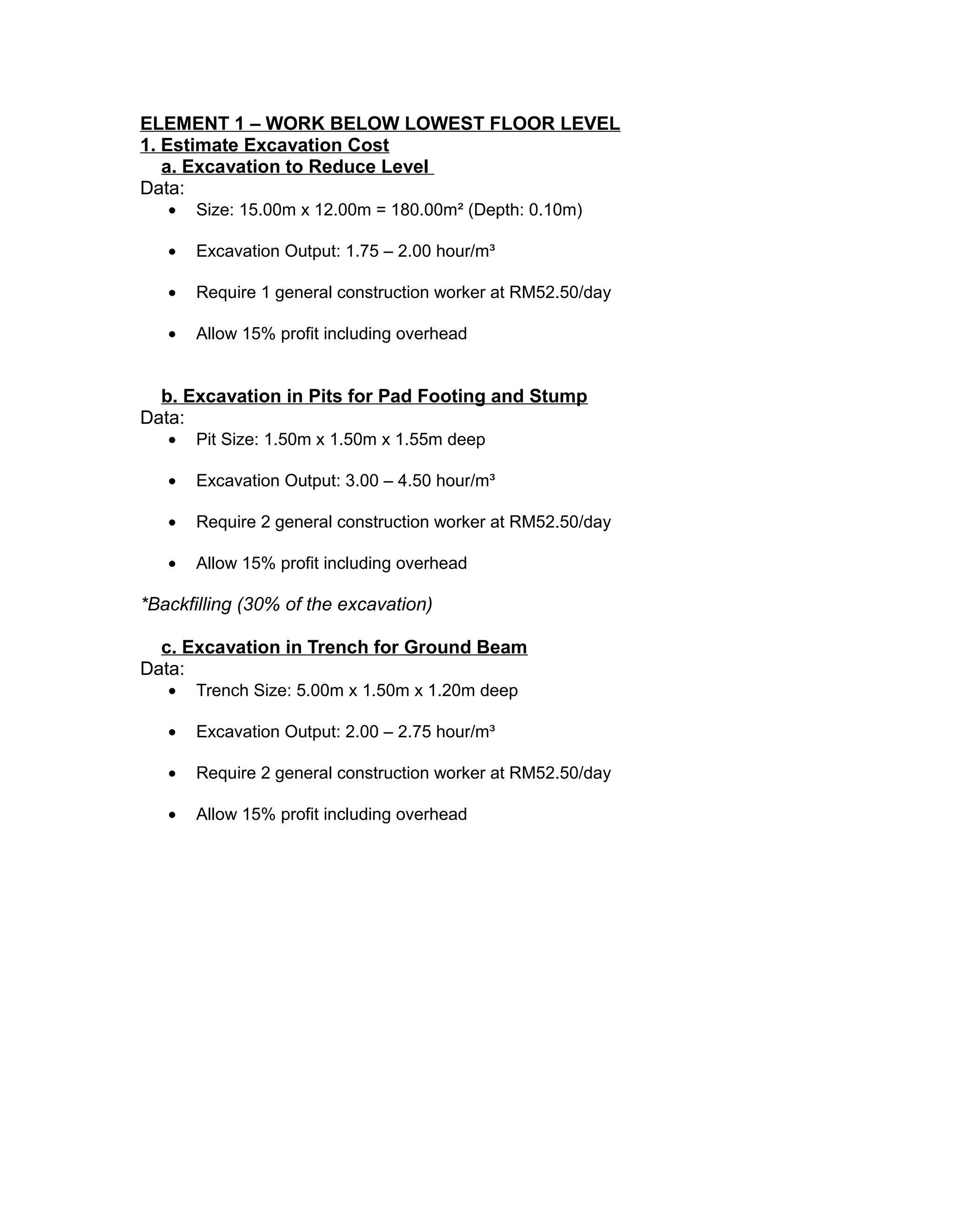 1. Estimates for excavation costs to reduce level, excavate pits for pad footings and stumps, and excavate trenches for ground beams.