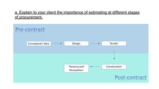 Estimating is important at different stages of procurement to control costs, allocate budgets, establish schedules, and help clients get competitive tenders. Pre-contract estimating predicts costs, time, and construction periods. Post-contract estimating is used for budget management, assessments, cost control, cash flow management, and assisting clients with changes. Measurement involves quantifying work, tendering is soliciting bids, and estimating predicts costs. Preliminaries are expenses like workers' accommodation, tools, scaffolding, temporary works, and insurance that are project running costs not included in materials, labor, or overheads.