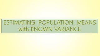 This document discusses parameter estimation and interval estimation. It defines point estimates as single values that estimate population parameters and interval estimates as ranges of values within which population parameters are expected to fall. It provides examples of using the sample mean and variance as point estimators for the population mean and variance. It also discusses how to construct confidence intervals for population parameters based on sample statistics, sample size, and the desired confidence level.