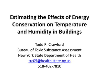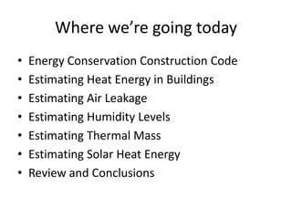 This document discusses estimating the effects of energy conservation on temperature and humidity in buildings. It covers the New York State Energy Conservation Construction Code (ECCC), methods for estimating heat loss, air leakage, humidity levels, thermal mass, and solar heat gain in buildings. The key points are that the ECCC aims to effectively use energy while allowing innovative approaches, and that a building's envelope is permeable to air, moisture, and heat transfer in complex ways.