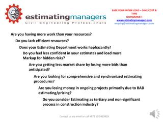 The document promotes estimating and quantity surveying services aimed at construction professionals facing resource challenges or inefficiencies. It highlights the benefits of outsourcing estimating tasks, offers various services including training, value engineering, and post-contract assistance, and emphasizes their experience with high-profile projects in the Middle East. Contact information and a call to action to ease workload and save costs through outsourcing are repeatedly noted.