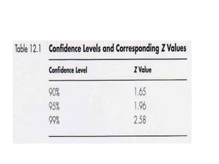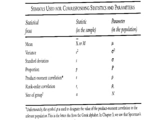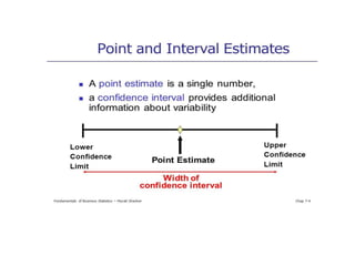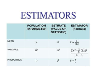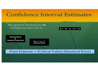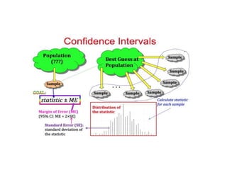 Estimation involves making inferences about a population based on a sample. An estimator is a statistic used to estimate unknown population parameters, and the estimate is the computed value. A good estimator is unbiased, efficient, and consistent. Confidence intervals provide a range of values that are likely to contain the true population parameter, depending on the sample size, confidence level, and variability of the data. Both confidence intervals and p-values provide important information but confidence intervals also convey the magnitude and strength of an effect.