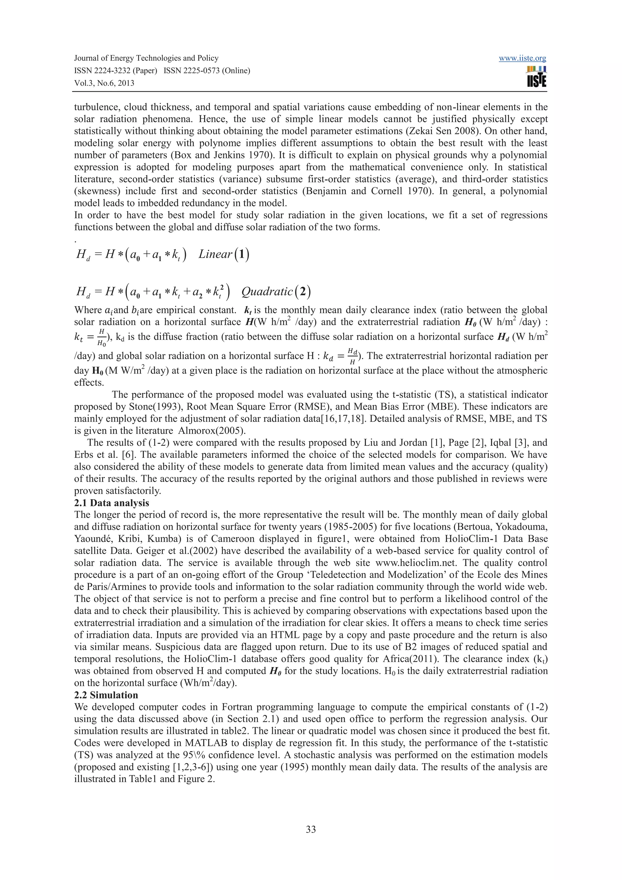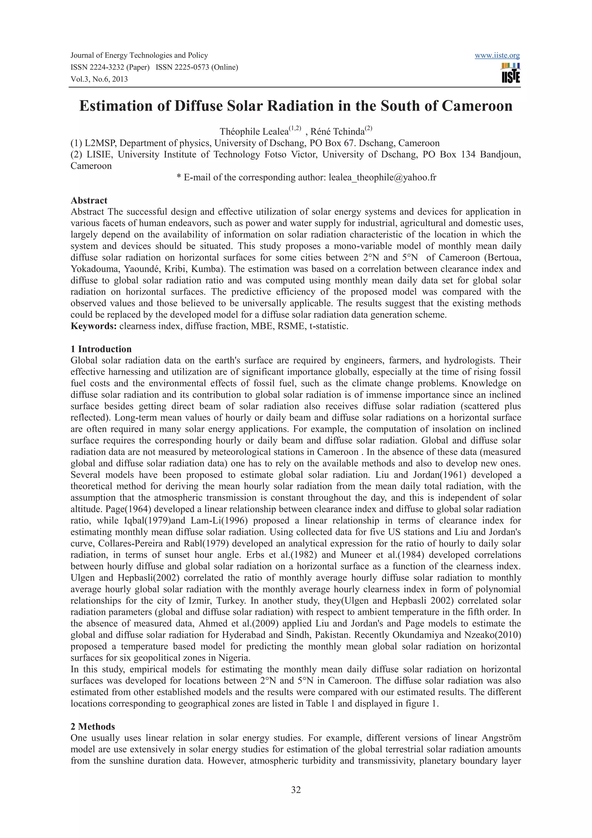 This document presents a study that developed models to estimate monthly mean daily diffuse solar radiation for locations in southern Cameroon between 2°N and 5°N latitude. It analyzed monthly mean daily data on global and diffuse solar radiation from 1985-2005 for five cities. Linear and quadratic regression models were developed relating diffuse fraction to clearness index. The proposed models were compared to existing models from Liu and Jordan, Page, Iqbal, and Erbs, finding the proposed models had better statistical performance and agreement with observed values. The study concludes the developed models can reliably estimate diffuse solar radiation for locations in southern Cameroon.