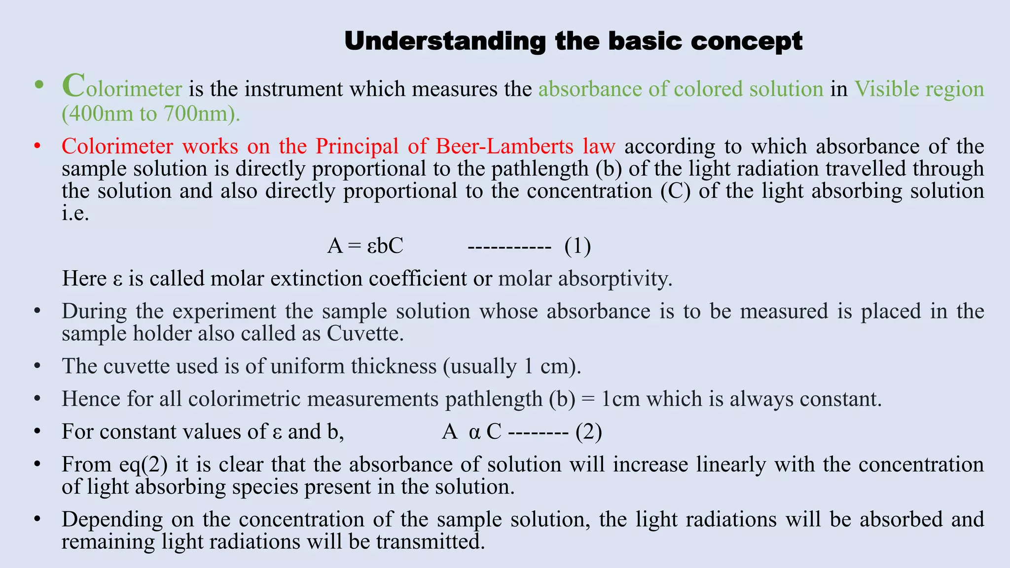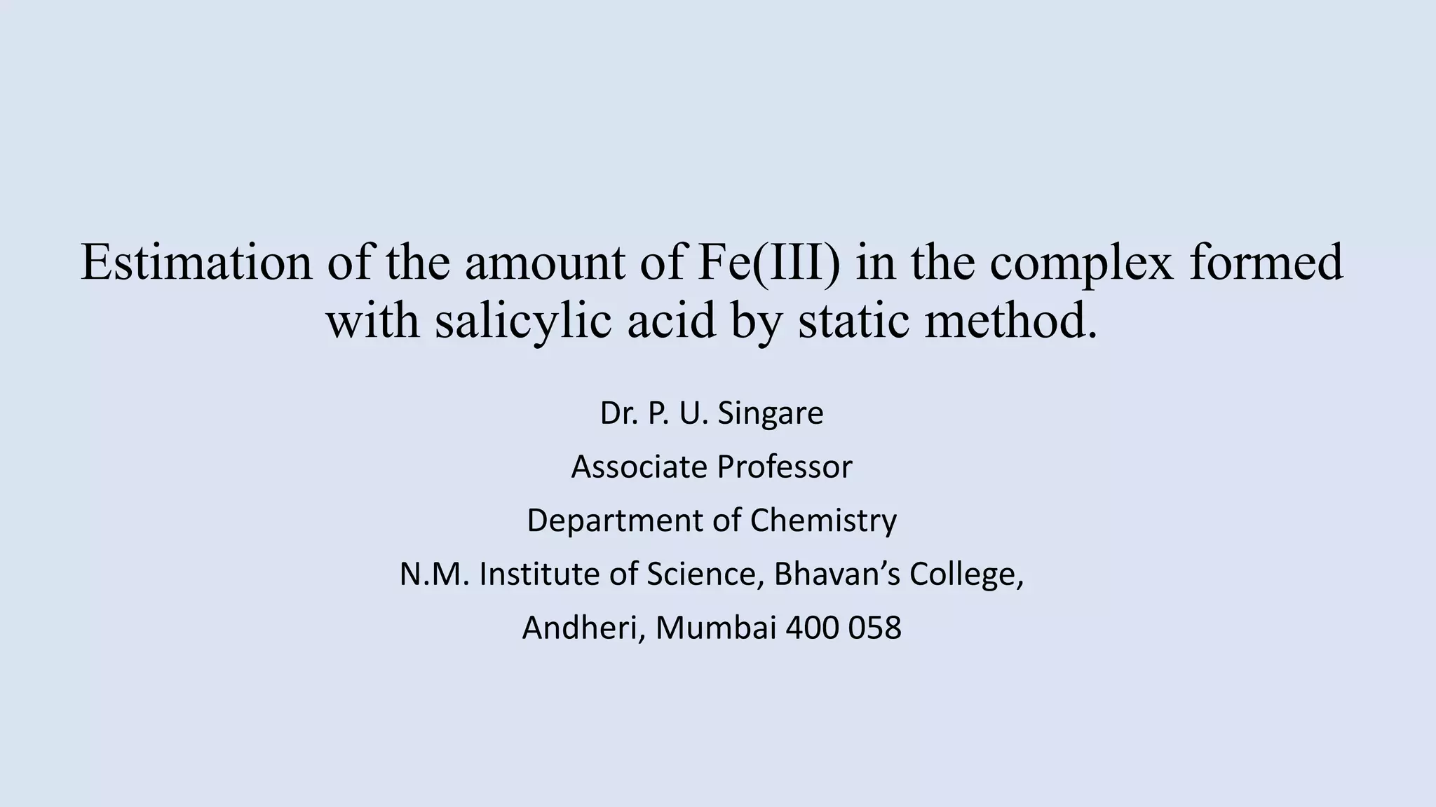 The document outlines the method for estimating Fe(III) in a complex formed with salicylic acid using colorimetry. It explains the principles of the colorimeter, including absorbance measurement and the creation of a calibration graph to determine unknown concentrations. The experiment involves static titration, where varying volumes of salicylic acid are added to a fixed volume of Fe(III) solution, and the optimal salicylic acid volume for color change is used to calculate the amount of Fe(III).