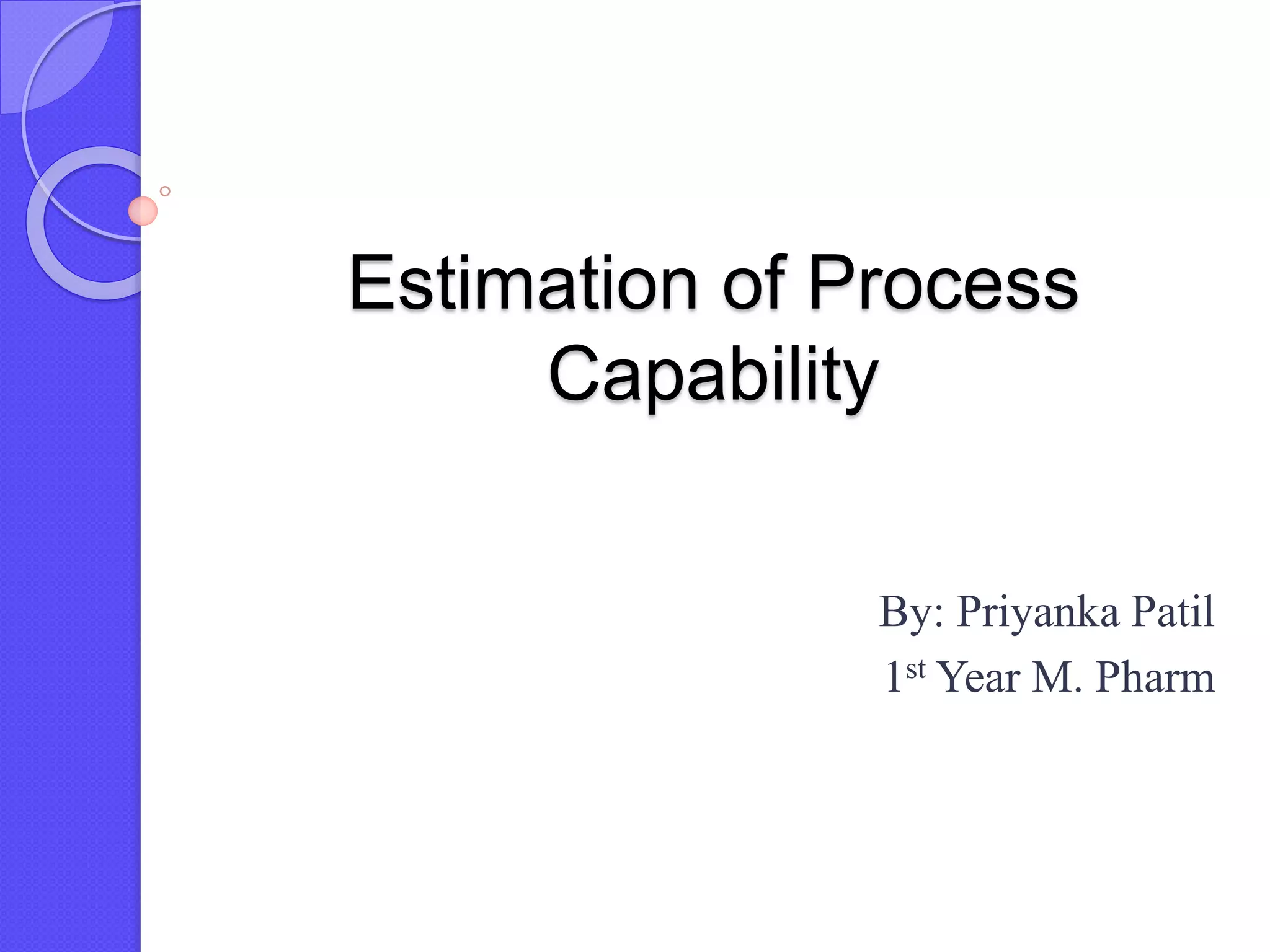 This document discusses process capability analysis, which relates a production process's variability to customer specifications to determine if the process is capable of meeting requirements. It defines key terms like critical-to-quality characteristics, control charts, process capability indices Cp and Cpk. Cp measures a process's potential capability if centered on target, while Cpk considers deviation of the mean. For a process to be capable, its natural variation (control limits) must be narrower than specifications. If Cpk=1 the process is barely capable, and if Cpk<1 the process is incapable and requires improvement. Process capability analysis assumes an in-control, stable production process.