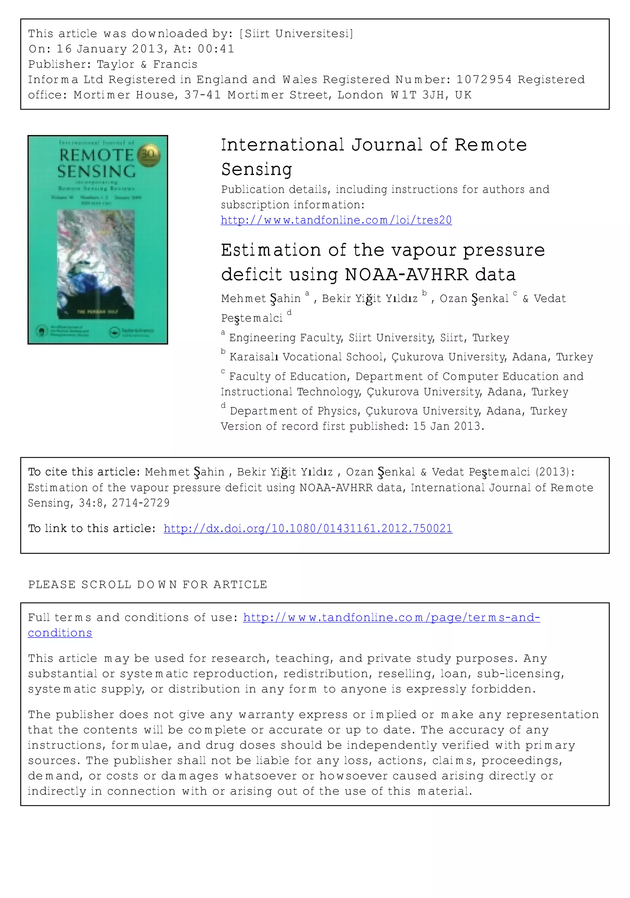 This article describes a study that estimates vapour pressure deficit (VPD) using NOAA-AVHRR satellite data. VPD is an important meteorological variable that influences many fields such as plant growth, disease transmission, and evapotranspiration. The study calculates land surface temperature and total precipitable water using NOAA-AVHRR data in order to estimate VPD, which is then statistically compared to VPD estimated from meteorological station data. The results show that VPD can be estimated from satellite data with a root mean square error of around 6 mb or less compared to ground measurements.