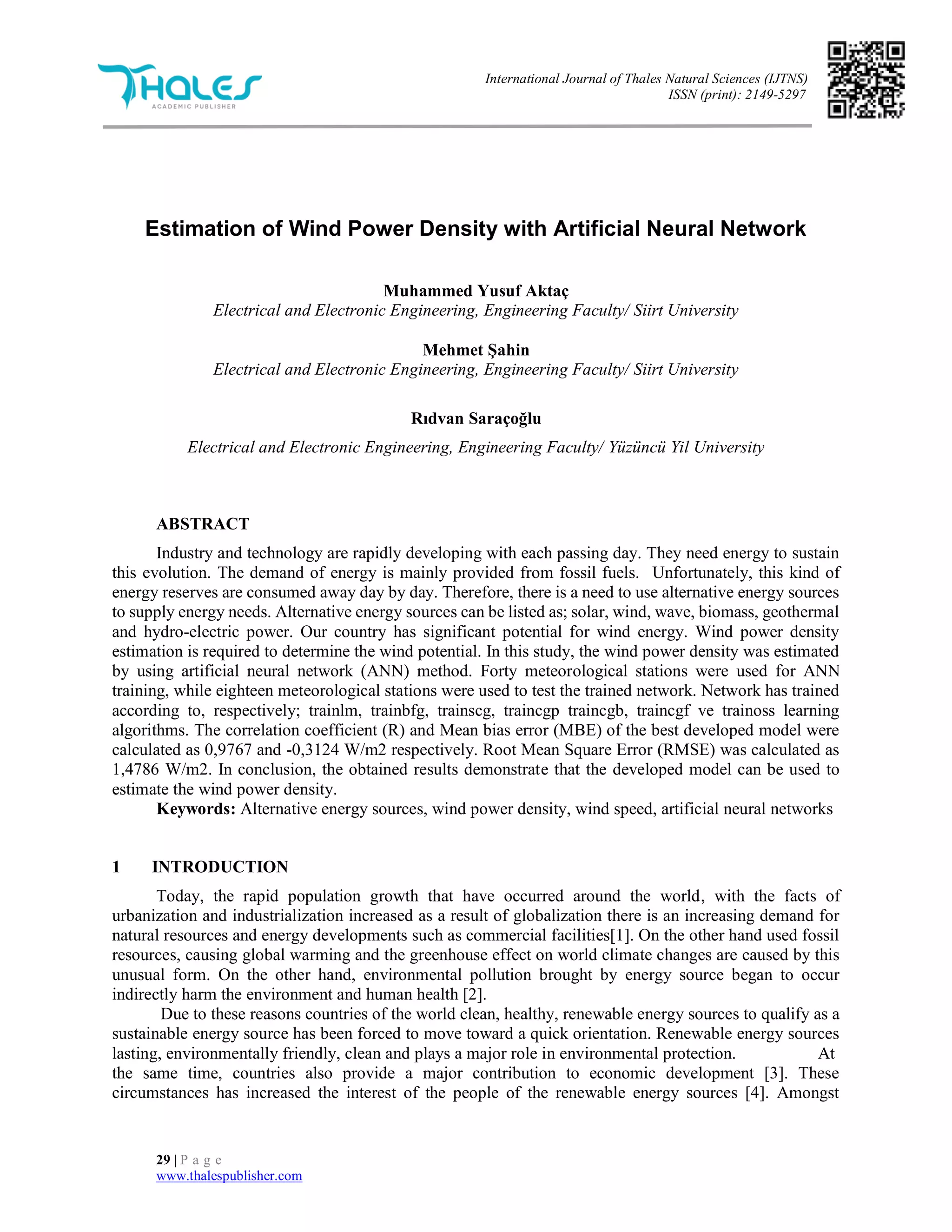 This study investigates wind power density estimation in Turkey using artificial neural networks (ANN), analyzing data from 58 meteorological stations between 1980 and 2013. Various learning algorithms were employed to train the network, achieving a correlation coefficient of 0.9767 and a mean bias error of -0.3124 W/m². The findings suggest that the developed model is effective for estimating wind power density, supporting the country's potential for renewable energy sources.