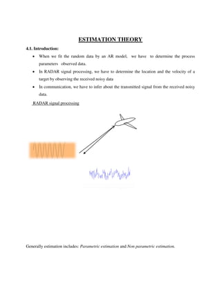 - Estimation theory involves using observed data to determine unknown parameters of a system. This includes problems like estimating locations/velocities from radar signals or inferring transmitted signals from received noisy data.