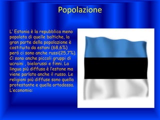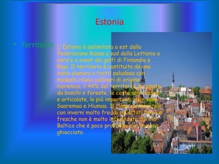 L'Estonia è situata tra la Russia e la Lettonia, caratterizzata da una pianura paludosa e un clima continentale. La popolazione è principalmente estone, con una significativa presenza di russi, e l'economia ha subito una transizione verso il mercato dopo l'indipendenza dall'URSS, puntando su agricoltura e settori industriali moderni. La capitale Tallinn conserva elementi medievali, mentre altre città importanti includono Tartu, Pärnu e Narva.