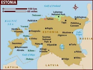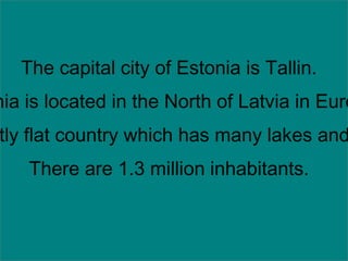 Estonia's capital is Tallinn, located in northern Europe. It is a flat country with many lakes and over 1.3 million inhabitants. Some notable Estonians mentioned include the athlete Erki Nool, writer Jaan Kross, and writer/film director Lennart Meri. Narva's castle is a famous site in Estonia and its famous product is fish.