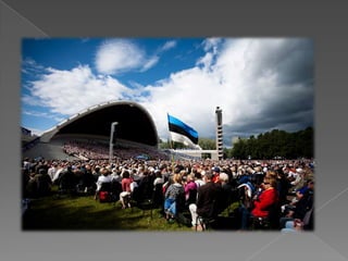 The document outlines the history of Estonian organizations in the UK, including the founding of the first Estonian organization in 1921 with 25 members, growing to 75 members by 1934. It discusses the establishment of Estonian communities in Leeds and London in 1946, and the founding of the first Estonian Lutheran Church by Ambassador Torma, who also served as the first pastor. The Estonian Voice newspaper was first published in 1947 founded by Jaak Taul. Cultural events for the Estonian community included singing festivals in 1953 in Bradford attended by over 1000 people. Schools teaching the Estonian language, history and culture started in the 1950s-60s. An Estonian home opened in Bradford on June 9, 1956 to serve the E