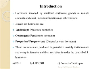 This document discusses the female sex hormone oestrogen. It notes that oestrogen, along with androgens and progestins, are the three main sex hormones produced in the gonads. Oestrogen is produced primarily in the ovaries and its secretion is controlled by FSH. The key functions of oestrogen include regulating ovulation and menstruation, developing secondary sex characteristics, and preparing the reproductive tract for pregnancy. Oestrogen acts by binding to estrogen receptors in target tissues. The document outlines the different types of estrogens and their biosynthesis and physiological effects. It also discusses structure-activity relationships and clinical uses and side effects of estrogens.
