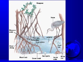 The document provides an overview of estuarine systems, including their definitions, types, communities, and threats. Estuaries are coastal areas where fresh and saltwater mix, supporting diverse ecosystems that are vulnerable to human activity and climate change. Various types of estuaries are described, alongside the specific adaptations of organisms that inhabit these environments and management practices to mitigate threats.