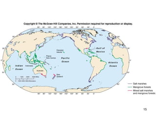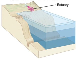 Estuaries are semi-enclosed areas where fresh water and seawater meet and mix, forming one of the most productive environments on earth. They serve as protected habitat and vital breeding and feeding grounds for many species. Cities were often built near estuaries due to the abundance of seafood. There are four main types of estuaries that form from different geological processes: drowned river valleys, bar-built, tectonic, and fjords. Estuaries have varying salinity levels and substrates that influence the distribution of species and ecological processes within them.