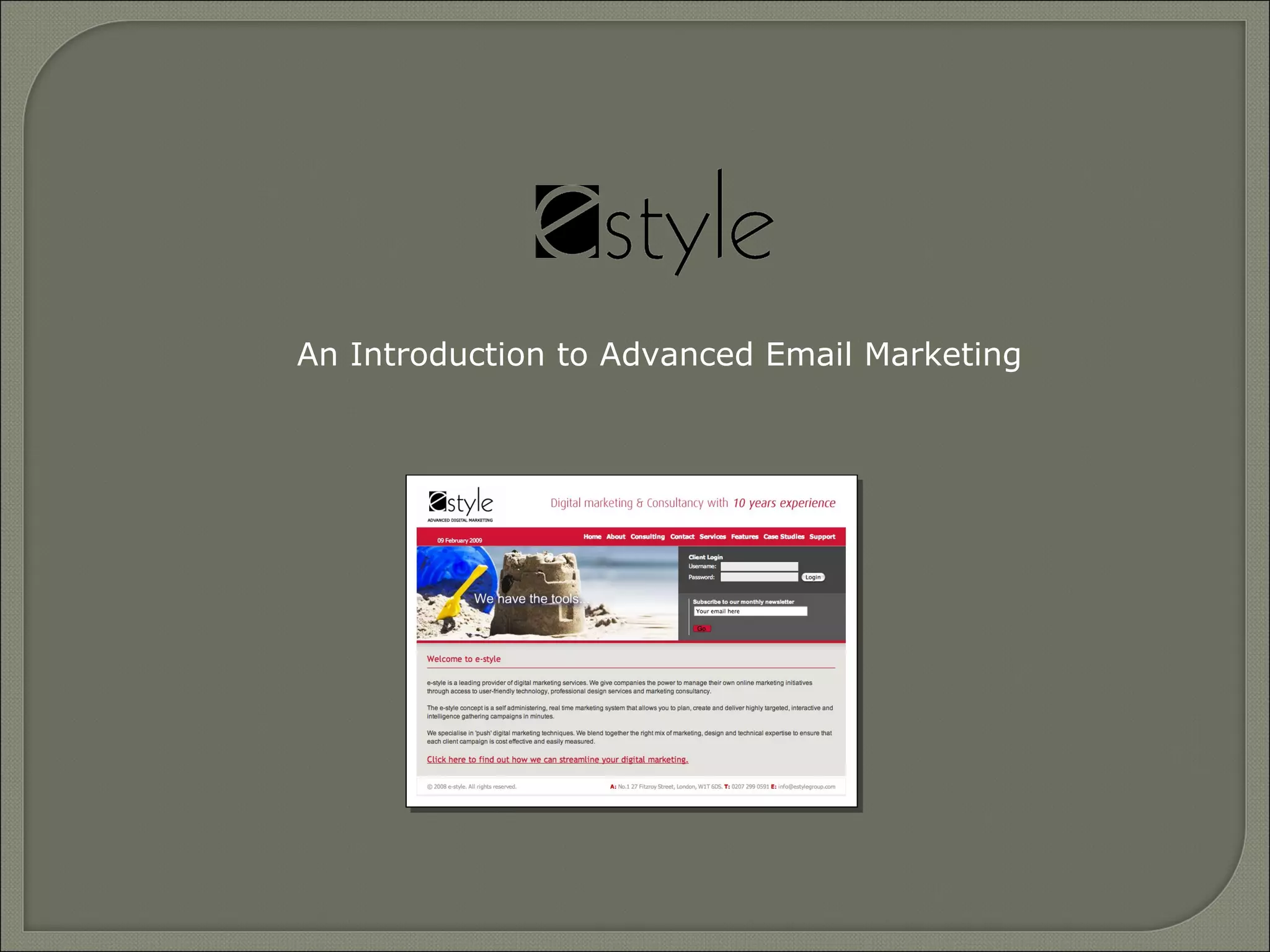 e-style is an email marketing platform that allows users to create highly targeted and personalized email campaigns. Key features include templates, forms, reporting, web tracking, and an address book. Campaigns can be used for communications, promotions, surveys, and more. Creation is simple without HTML knowledge. Reporting provides analytics on opens, clicks, and interactions to optimize future campaigns.