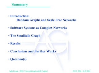 This document summarizes research analyzing the class relationship graphs of four Smalltalk systems. The researchers found that the degree distributions of the graphs follow power laws rather than a Poisson distribution, indicating the graphs have scale-free properties like many real-world networks. They conclude the object-oriented structures of the Smalltalk systems exhibit heavy-tailed distributions and regularities in their characteristic exponents. Further work is proposed to correlate graph properties with software quality and develop growth models of software graphs.