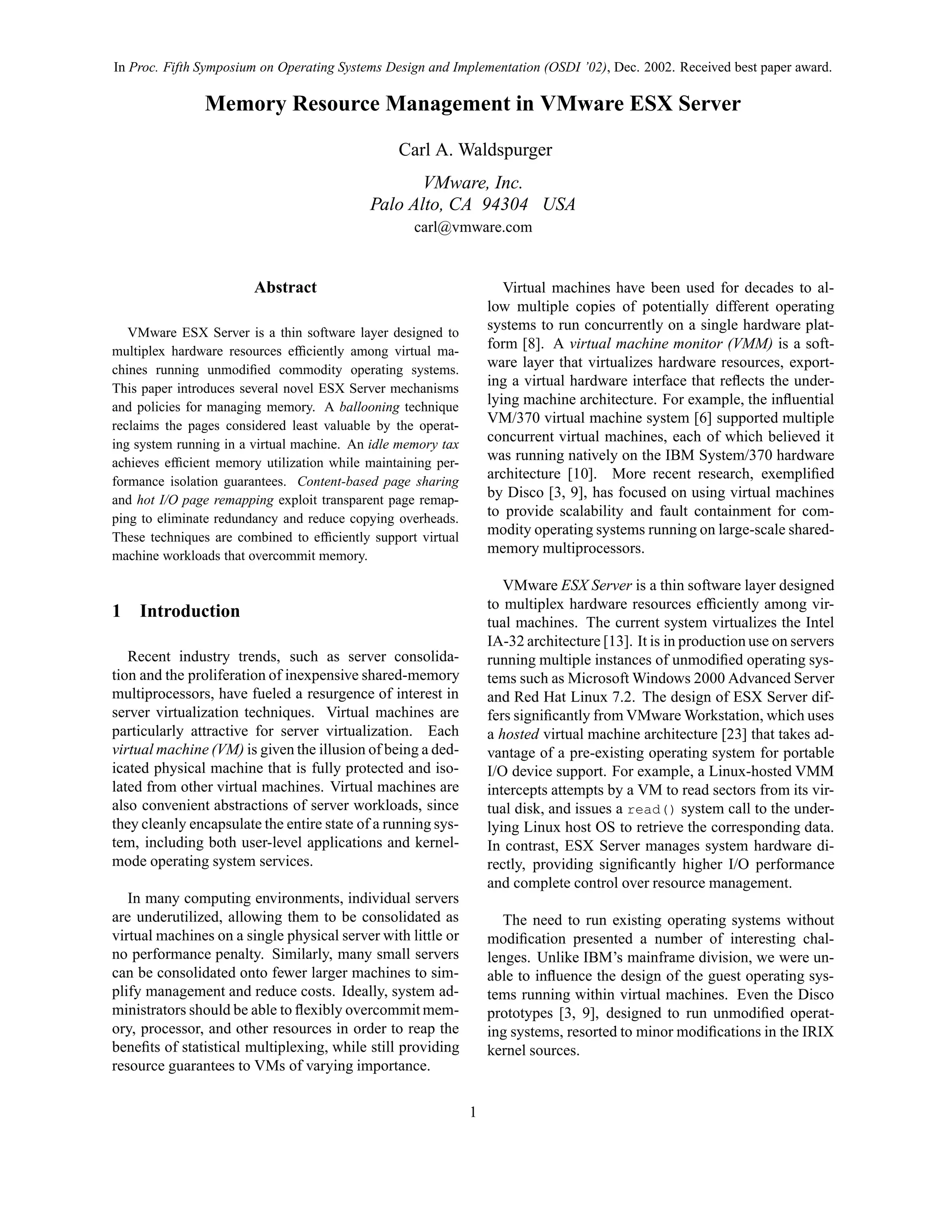 VMware ESX Server uses several novel techniques to efficiently manage memory resources across virtual machines: