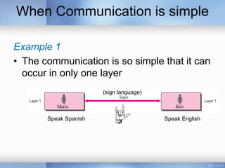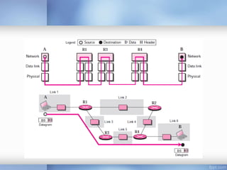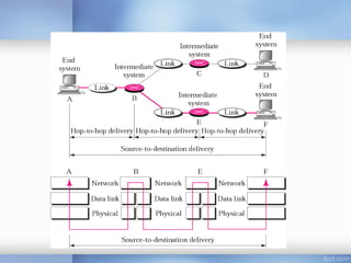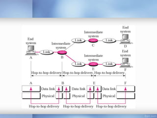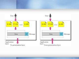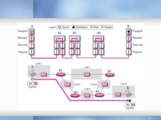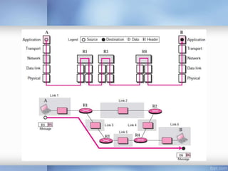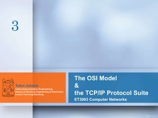 This document provides an overview of the OSI model and TCP/IP protocol suite for computer networks. It describes the seven layers of the OSI model from the physical layer to the application layer and their functions. It then explains that while the OSI model was intended as a standard, TCP/IP became dominant in practice. The four layers of the TCP/IP protocol suite are also outlined - the physical and data link layers have no standard protocols, while the network layer uses IP and the transport layer includes TCP and UDP. The application layer combines functions from several OSI layers.