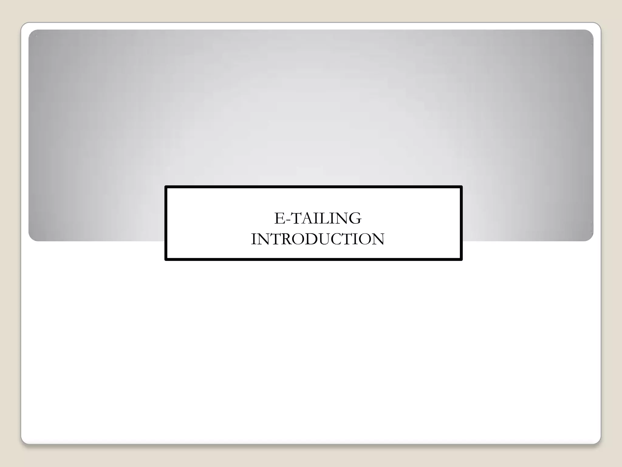 E-tailing refers to the selling of retail goods online. It allows companies to sell products to customers virtually without needing a physical storefront. E-tailing has grown significantly in recent years and enabled the development of software tools to help companies create online catalogs and manage the online sales process. Some benefits of e-tailing include reducing business costs and space needs while increasing accessibility of products to customers. However, e-tailing also lacks some of the experiential and sensory aspects of in-person shopping.