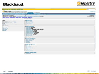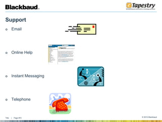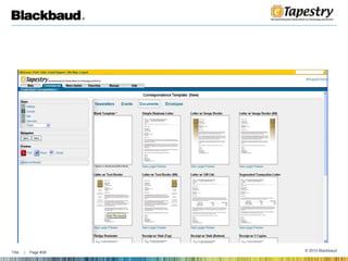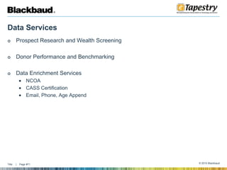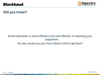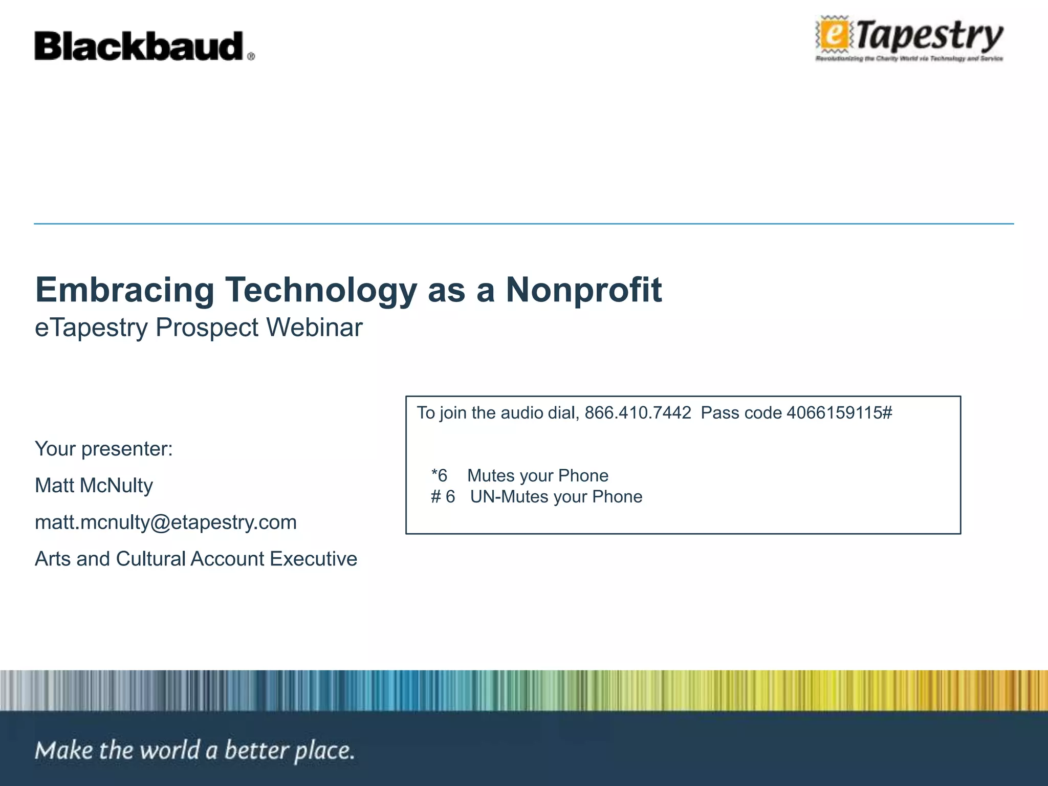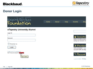 The document discusses a webinar presentation about the nonprofit fundraising and relationship management software eTapestry. It outlines eTapestry's features such as donor tracking, online fundraising, email marketing, reporting, and integration capabilities. The presentation emphasizes how eTapestry can help nonprofits improve fundraising, increase efficiencies, and enhance donor relationships through technological solutions and partnership.