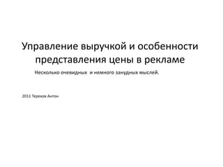 Документ рассматривает управление выручкой и динамическое ценообразование в рекламе, подчеркивая влияние изменения цен на маржинальность бизнеса. Приводятся примеры из индустрии, включая использование систем динамического ценообразования авиакомпаниями и ритейлерами. Основные выводы акцентируют внимание на важности привлечения 'хороших' клиентов и оптимизации рекламных затрат вместо предоставления скидок.