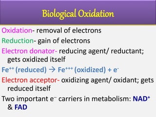 The document summarizes electron transport chain and oxidative phosphorylation. It discusses:
