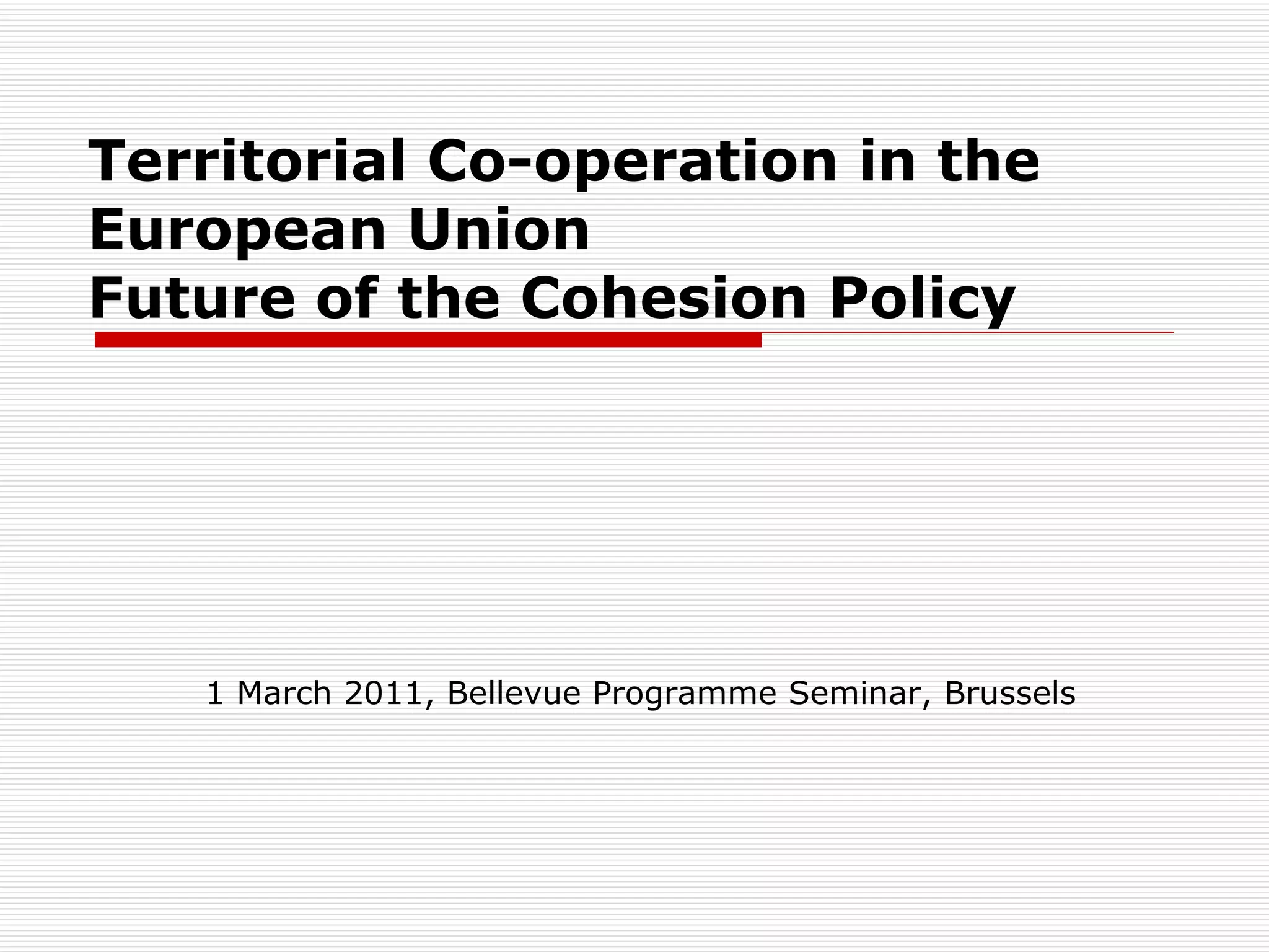 Territorial co-operation in the EU focuses on reducing disparities between regions and promoting economic and social cohesion. It includes cross-border cooperation programs along internal and external EU borders, transnational programs covering larger areas, and interregional cooperation building networks across Europe. Macro-regional strategies have also been developed for the Baltic Sea and Danube regions to coordinate actions addressing challenges like environmental issues, economic development gaps, and poor transport connectivity.