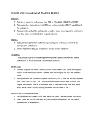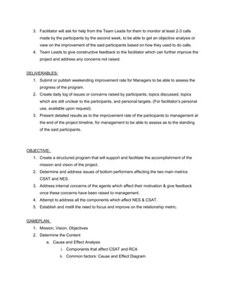 The document outlines a training course to improve the performance of underperforming customer service agents. The 4-week course aims to advance agents' skills in customer satisfaction (CSAT) and relationship metrics (NES) through 60 hours of training. Agents must meet targets of 68% for NES and 93% for CSAT or face disciplinary action. The facilitator will track agents' progress, issues, and results to present to management. The goal is to transform bottom performers into positive contributors through a structured program addressing the key factors affecting CSAT and NES.