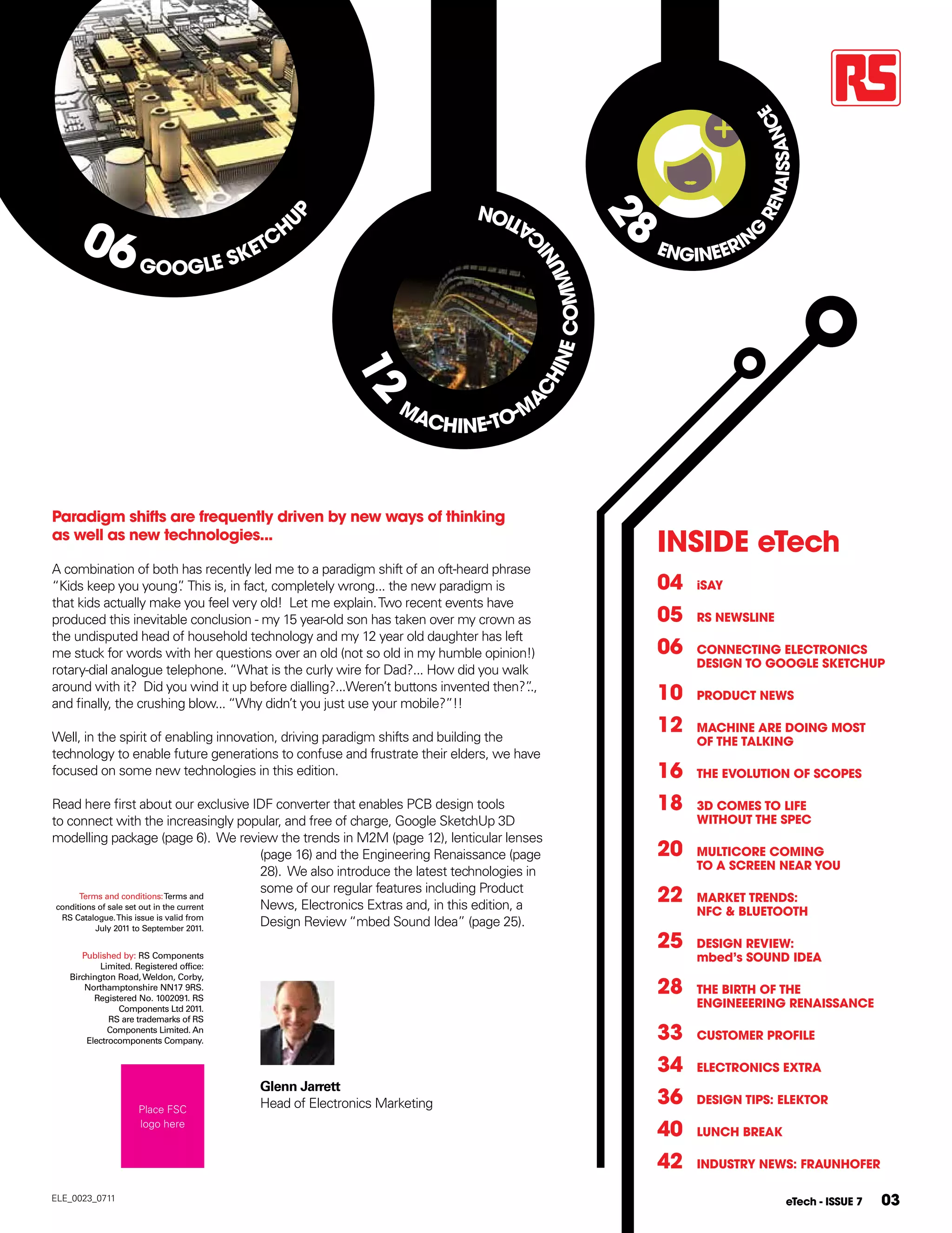 The document discusses recent events that have led the author to conclude that kids actually make you feel old rather than keep you young. His 15-year-old son has taken over as the head of household technology and his 12-year-old daughter questioned him about an old rotary-dial phone, asking why he didn't just use his mobile. The document also previews new technologies covered in the issue, including an IDF converter that connects PCB design tools to Google SketchUp and reviews trends in M2M, lenticular lenses, and the engineering renaissance.