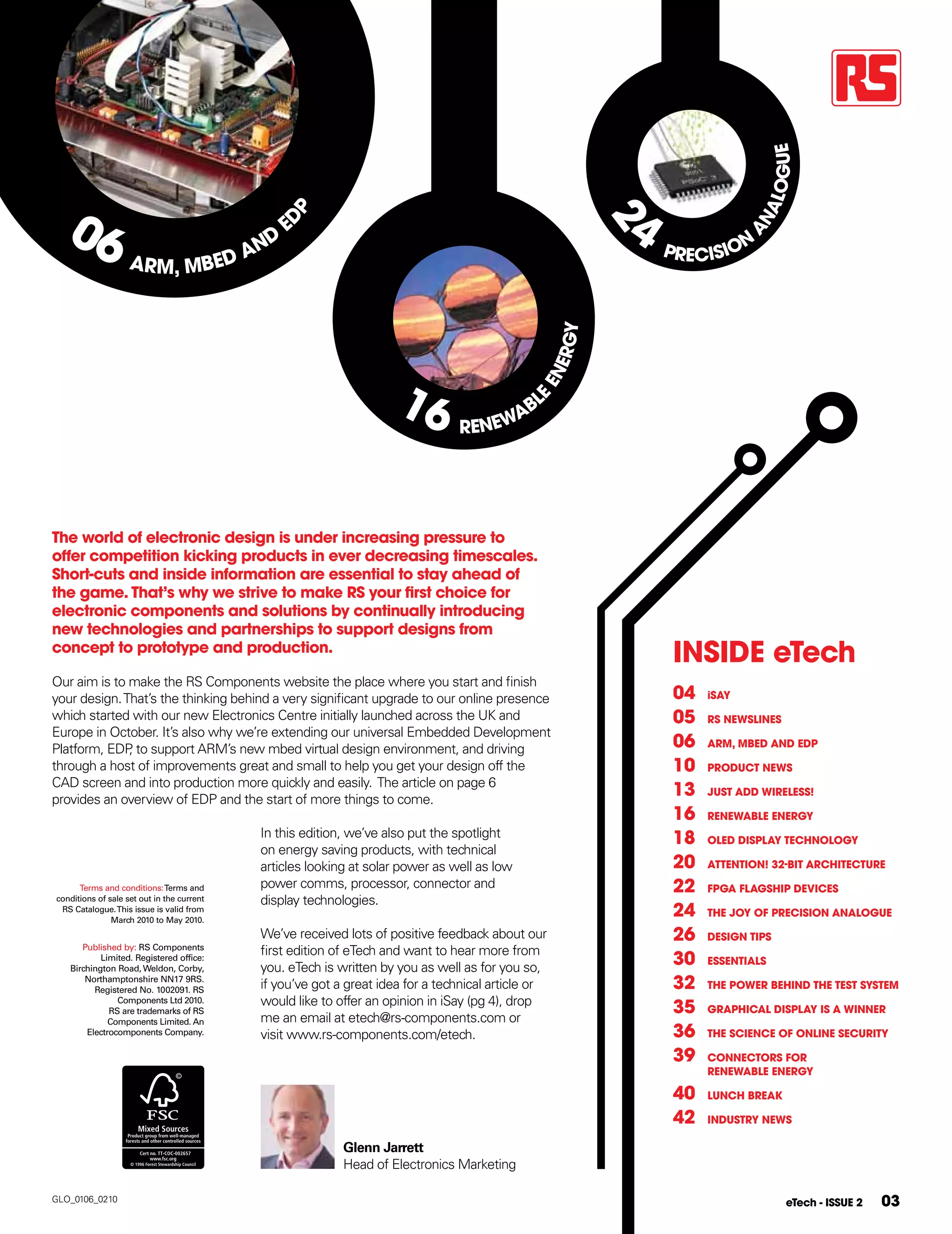 The document is an issue of an electronics magazine published by RS Components. It highlights several topics, including: