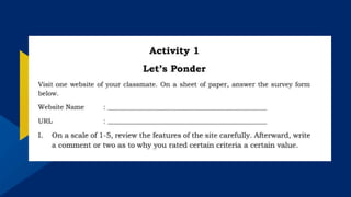 This document discusses multimedia and interactive content in the context of Web 2.0. It explains that multimedia engages users' senses and catches their attention. It also discusses how user experience measures the usefulness of products and services. The document notes that understanding the connection between multimedia and information and communication technology (ICT) allows one to effectively create rich online content as a developer. It provides instructions for activities analyzing websites' strengths and weaknesses, comparing and contrasting websites, creating a blog post about infographics, and producing an educational video blog about multimedia and ICT.