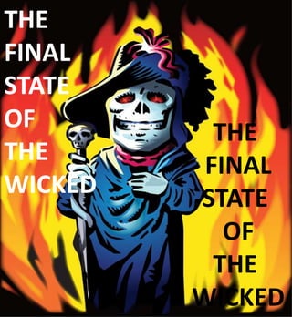 The document discusses different views on the final state of the wicked and the nature of hell. It examines four main views: [1] life after death is unlikely, [2] everyone goes to heaven, [3] unbelievers get a chance after death to accept salvation, and [4] unbelievers are ultimately destroyed. It then analyzes arguments for eternal punishment in hell based on biblical texts, noting that terms like "perish" refer to loss of well-being, not being. The document concludes that Jesus spoke more about hell than anyone and the biblical teaching portrays hell as a place of conscious, eternal torment for those who reject God.