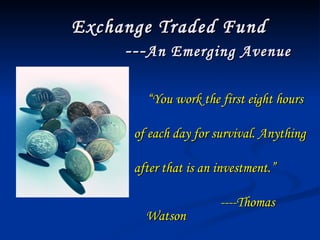 Exchange Traded Funds (ETFs) are a hybrid product that combines aspects of stocks and mutual funds. Like stocks, ETFs trade on exchanges throughout the day, while like mutual funds, they comprise a basket of underlying holdings like an index or commodity. ETFs offer investors minimum investment amounts, low costs, and the ability to gain instant exposure to markets or sectors. However, ETFs remain unpopular in India due to a lack of understanding about ETFs, fewer product options compared to other countries, and an inability to automatically reinvest dividends.