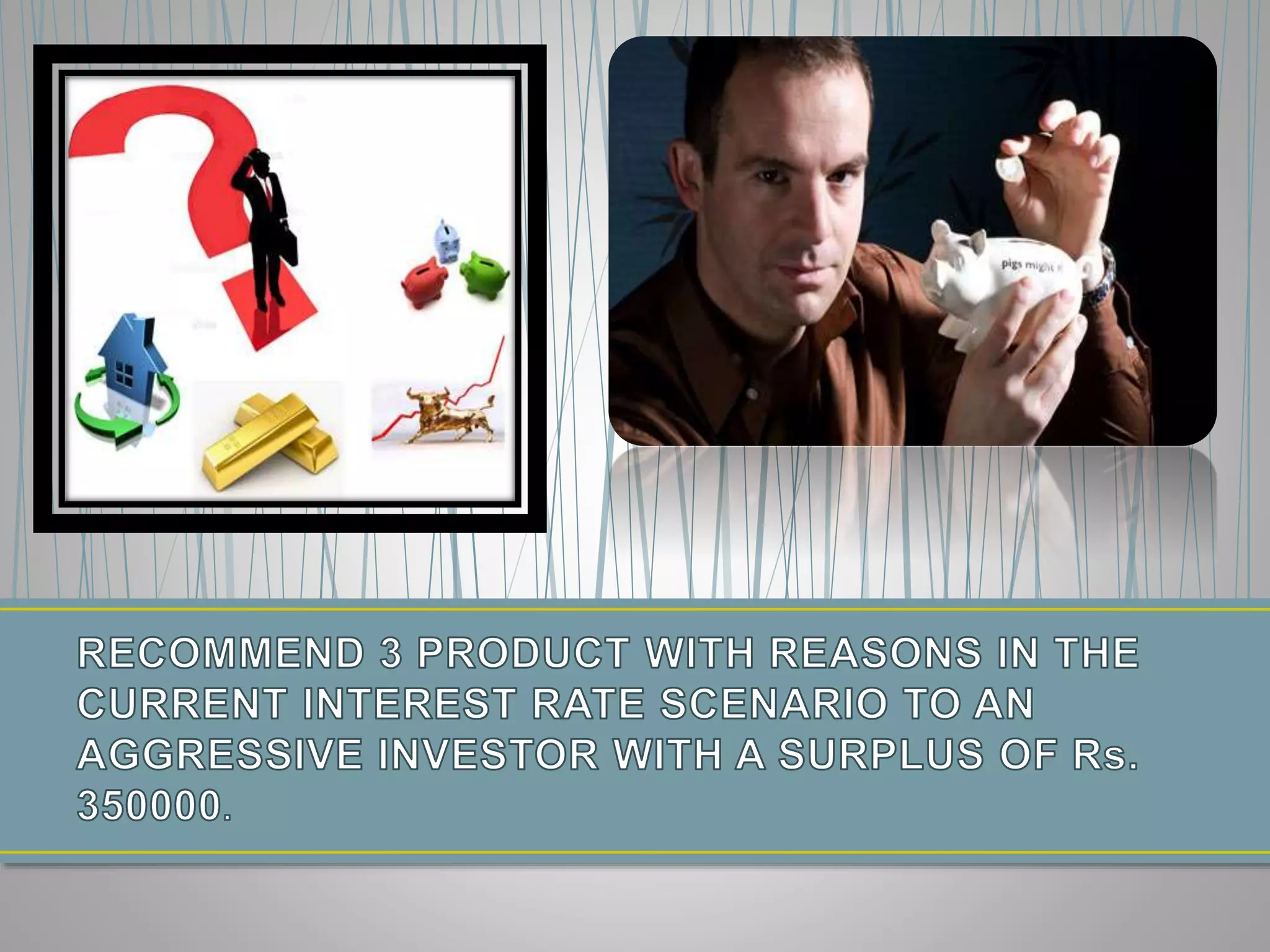 This document summarizes investment options for a client looking to invest Rs. 350,000 for one year with a high risk tolerance. It analyzes three potential investments: a fixed deposit, gilt mutual fund, and equity investment. It provides details on interest rates, risks, and projected returns for each option, with the equity investment in Oracle Financial Services Limited projecting the highest return of 24.19% despite also carrying the highest risk. The document recommends the equity investment option based on the client's risk profile and goal of seeking profit over safety of principal.