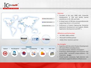 The company was founded in 2000 with headquarters in the USA and subsidiaries in the UK, UAE, and India. It has over 200 professionals supporting clients in 16 countries. Key services include product engineering, application development, mobile apps, and ERP. It is ISO and Microsoft certified and has expertise in all phases of product development from concept to delivery. It offers solutions for various industries including healthcare, real estate, e-commerce, trading systems, and travel. Services can be provided onsite, offshore, or through a global delivery model for optimal collaboration and cost benefits.