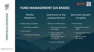 Cheng On Tsun from HKU had the 4th highest trading score. His portfolio consisted of 3 US stocks - Tesla (TSLA), Futu Holdings (FUTU), and GameStop (GME). He employed swing trading and momentum trading strategies, rebalancing his portfolio weekly. While his portfolio emphasized short-term growth, he aimed to mitigate risks through diversification across industries and markets.