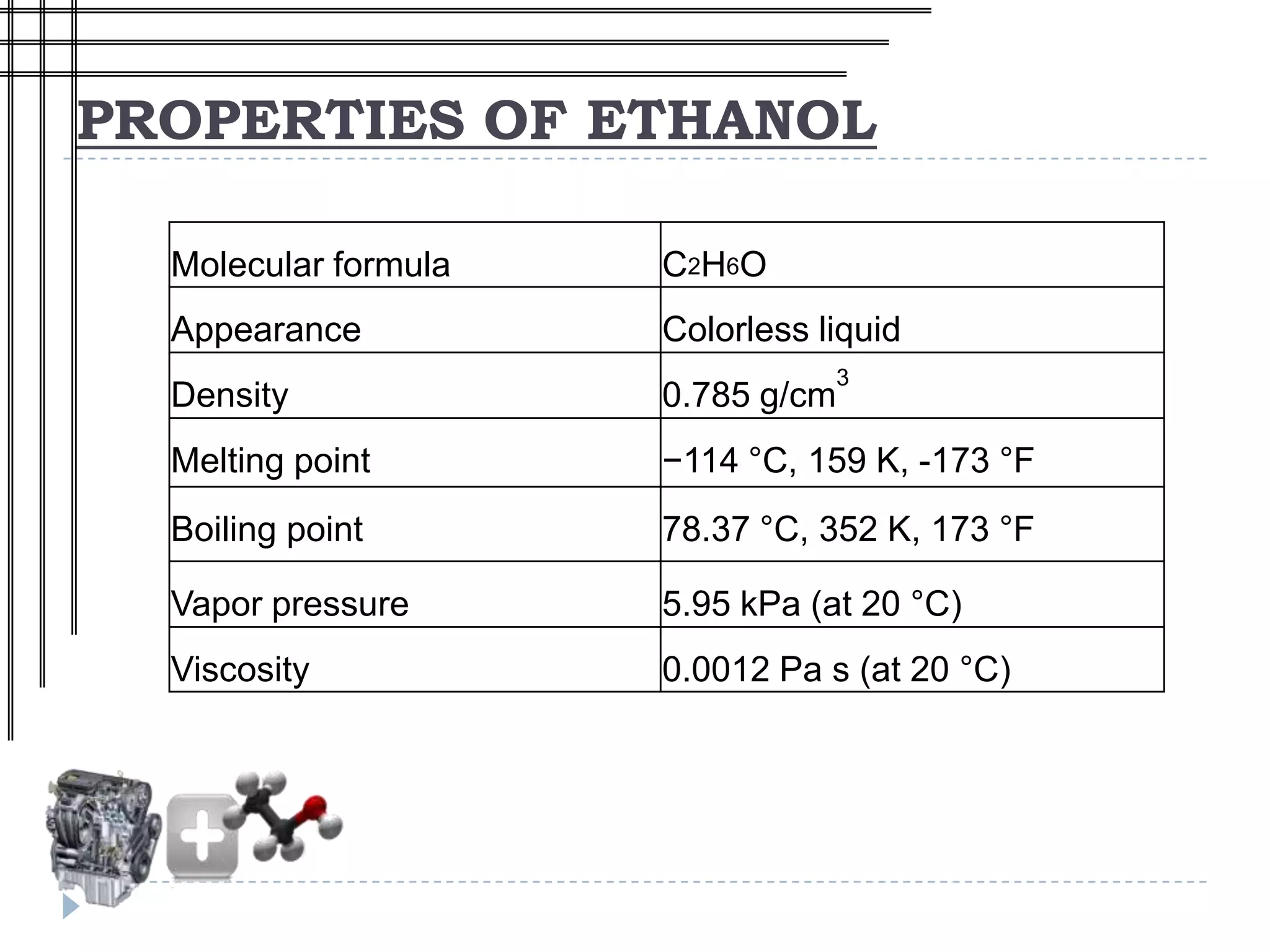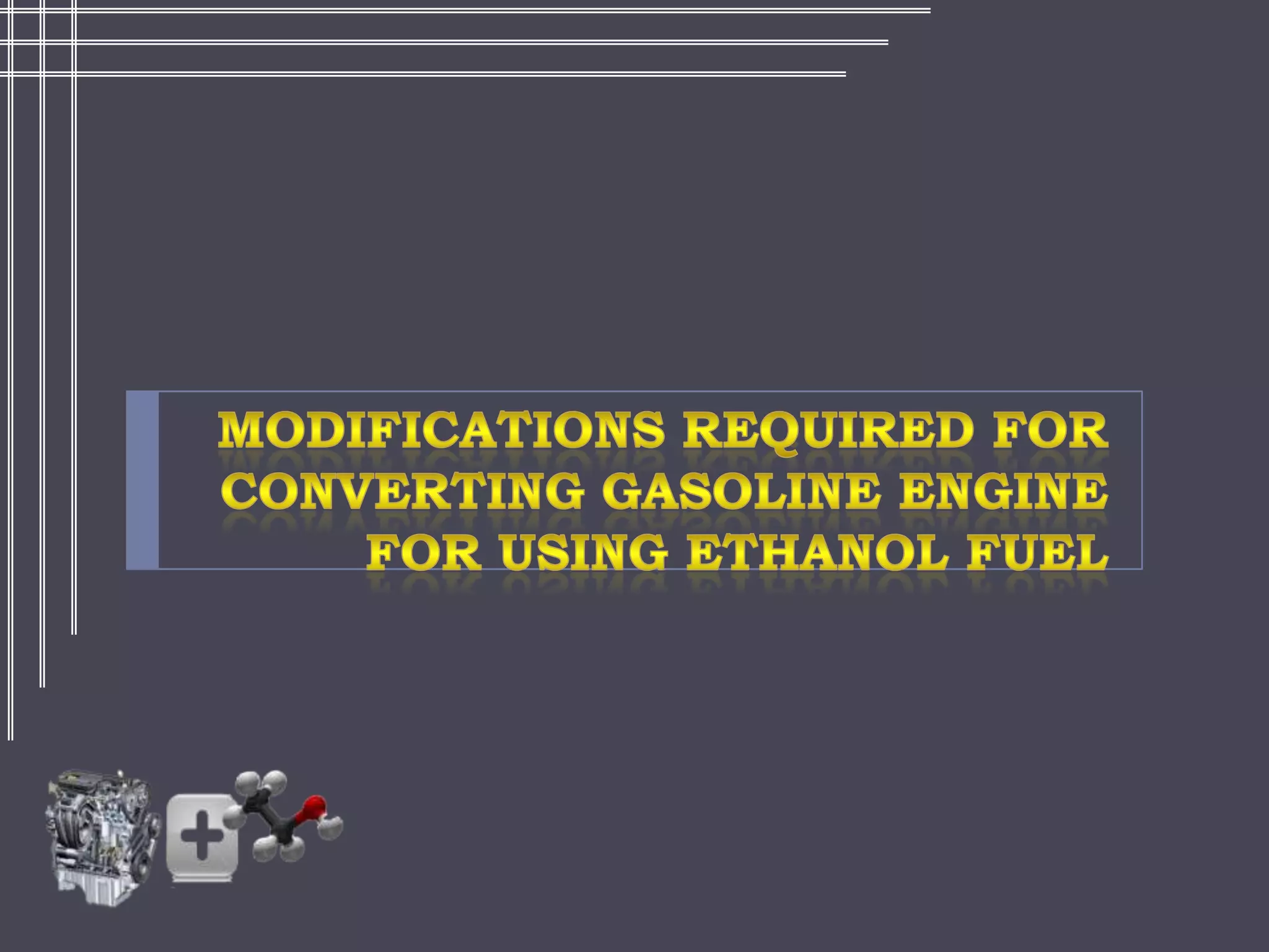 Modifications are needed in gasoline engines to use ethanol fuel blends. For blends up to E10, no changes are typically needed. For higher blends, modifications like increasing the diameter of inlet orifices and the accelerator pump are required to properly adjust the air-fuel ratio. Additional changes like increasing the compression ratio or installing pre-heating systems may be needed for cold starting when using high-ethanol blends. Proper adjustments can help utilize the higher octane and cleaner burning properties of ethanol fuel in engines.