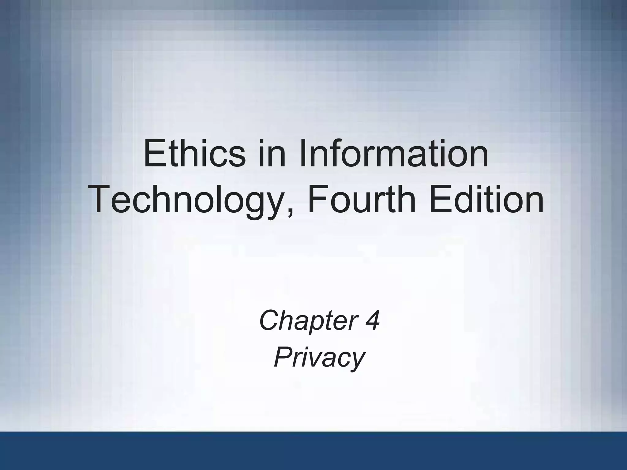 This document discusses privacy issues related to information technology. It covers several topics: laws protecting privacy of personal data; identity theft; electronic discovery; consumer profiling; treating consumer data responsibly; workplace monitoring; and advanced surveillance technologies. The chapter aims to balance the needs of businesses to collect and use data with individuals' rights to privacy.