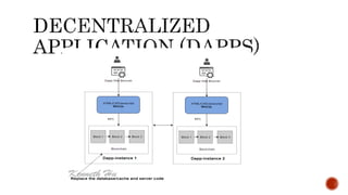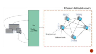 There are multiple Ethereum clients written in different programming languages by different organizations to interact with the Ethereum network. These include go-ethereum in Go, Parity in Rust, cpp-ethereum in C++, and others in languages like Python, Javascript, Java, Haskell, and Ruby. There are also Ethereum libraries for interacting with clients from different languages like Web3.js for JavaScript, web3J for Java, and others for C# and Ruby. Local Geth can be used with IDEs like Remix, libraries like Web3.js, and dapp browsers like MetaMask to build dapps using Solidity as the smart contract language and technologies like HTML, CSS and JavaScript for the