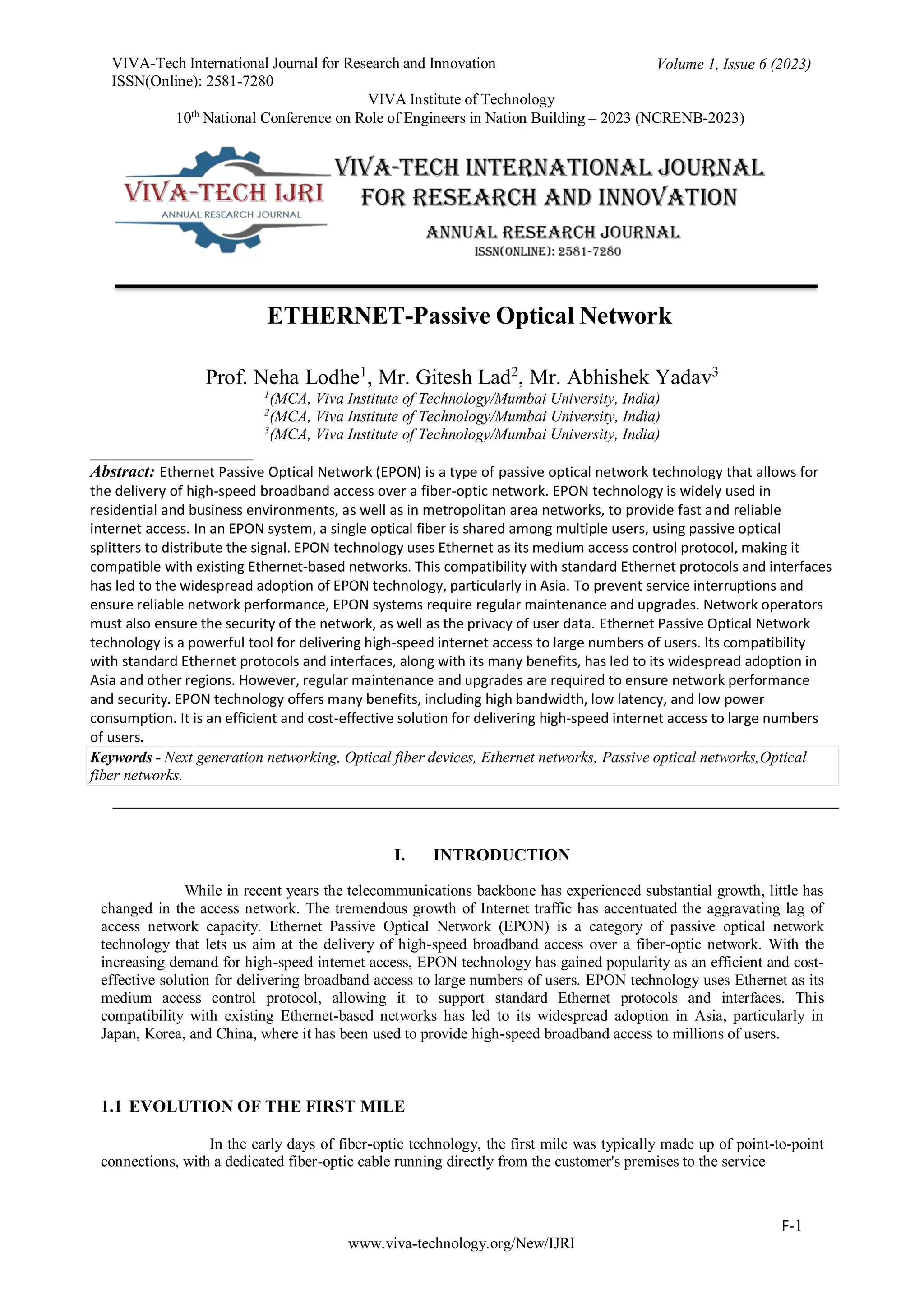 The document discusses Ethernet Passive Optical Network (EPON) technology, which provides high-speed broadband access over fiber-optic networks and is widely adopted, particularly in Asia. It describes the network architecture, key components, and multiple access methods like TDMA and WDMA while emphasizing the importance of network maintenance and monitoring for performance and security. Additionally, it highlights the evolution of EPON technology, including advancements like 10G-EPON and NG-PON2, addressing the growing demand for internet services.