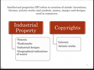 This document discusses various types of intellectual property including patents, trademarks, copyrights, industrial designs, and trade secrets. It provides examples and requirements for each type of intellectual property. Key points include:
