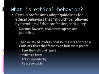The document discusses ethical challenges faced by journalists and provides guidance on navigating complex situations. It outlines the Society of Professional Journalists' code of ethics focusing on truth, minimizing harm, independence, and accountability. The document then examines various ethical dilemmas journalists may encounter and potential approaches based on principles of truth, fairness, minimizing harm, and serving the public interest.