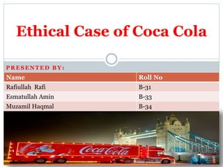 This document presents an ethical case study of Coca-Cola. It discusses Coca-Cola's global dominance and large portfolio of over 300 brands worldwide. It performs a SWOT analysis of Coca-Cola and identifies unethical practices like criminal negligence as well as ethical practices like their corporate responsibility and ethics compliance programs. It concludes that Coca-Cola owes its success to employees and takes care of them while working with governments and agencies to ensure safety.