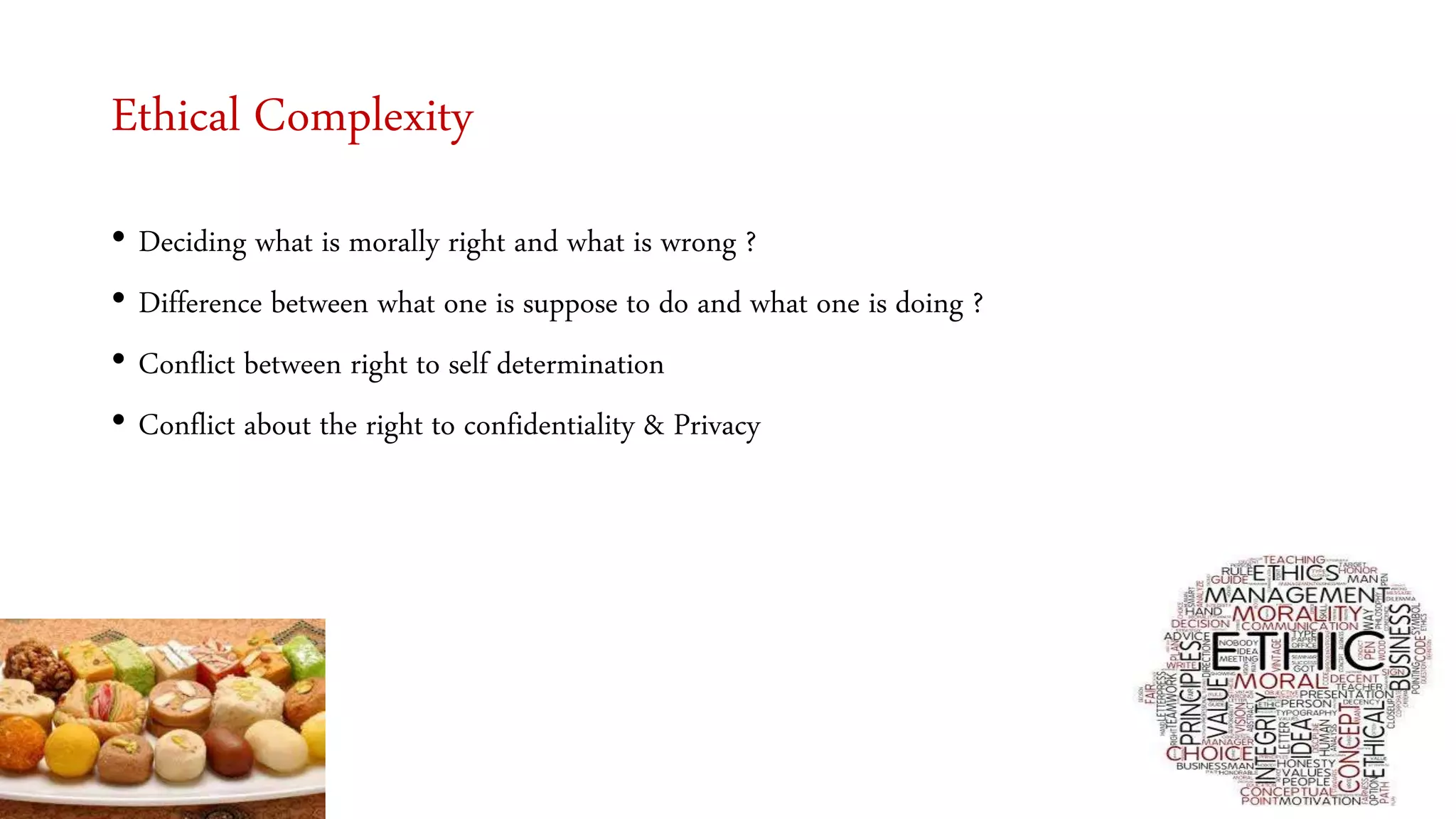 The document discusses ethical dilemmas faced in the workplace, including maintaining confidentiality and privacy, and conflicts between self-determination and work obligations. It provides examples from the author's experience at ICICI Bank and Ernst & Young of challenges balancing work demands with personal boundaries, such as being asked about personal life and taking unnecessary trips with clients. The author refused certain requests and ensured work on government projects was completed despite facing pressures to stop work.