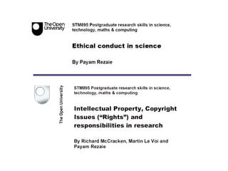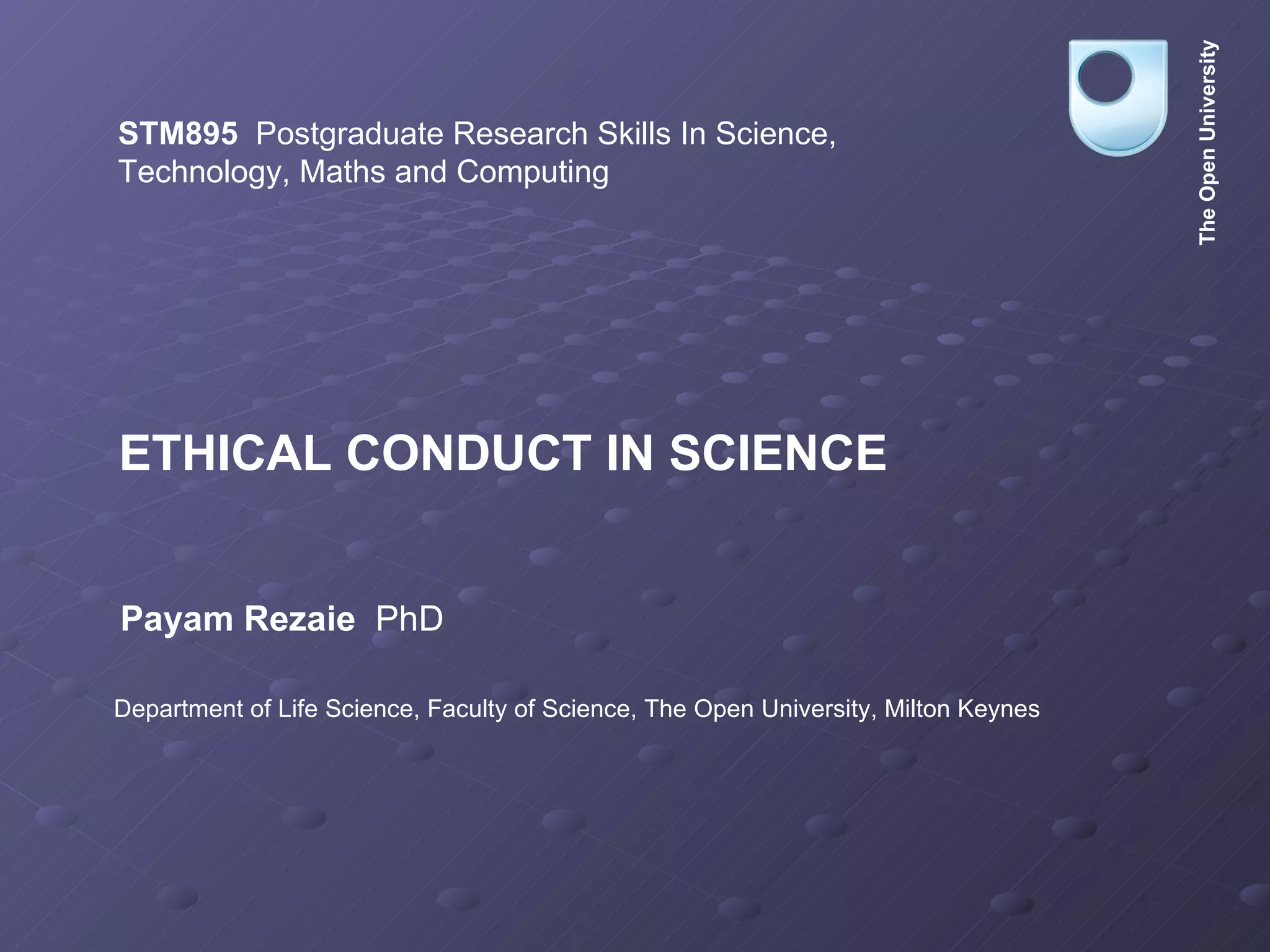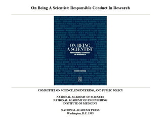 This document outlines the ethical principles and responsibilities in scientific conduct. It discusses the need for ethical standards to ensure science benefits society and avoids harm. Some key responsibilities are outlined, including for researchers to maintain integrity, for institutions to define policies, and for funding bodies and journals to enforce guidelines. The goals are to foster trust in science and accountability among all involved parties.