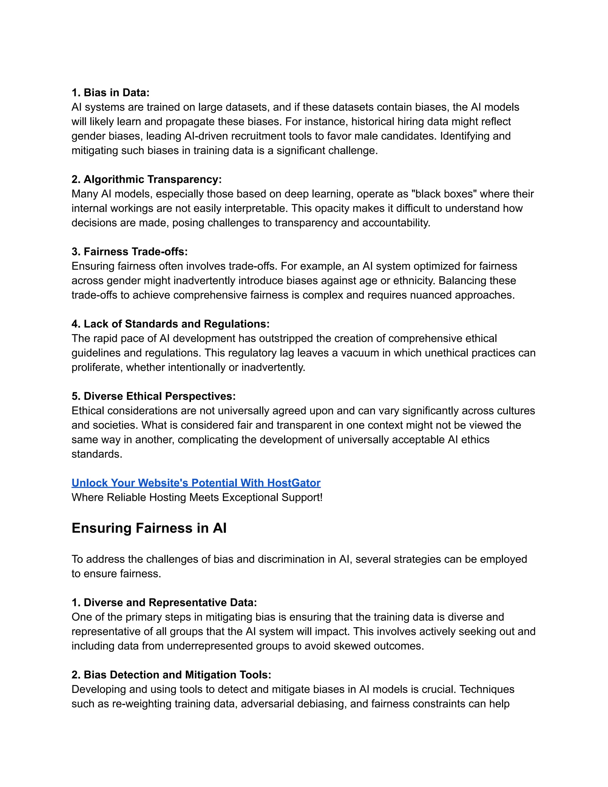 The document discusses the ethical considerations in artificial intelligence (AI) development, focusing on the importance of fairness and transparency. It highlights the challenges posed by bias in data, algorithmic opacity, and the lack of regulatory standards, while offering strategies to mitigate these issues through inclusive design, bias detection tools, and explainable AI. The document concludes that prioritizing ethical practices is essential for ensuring AI technologies benefit society equitably and justly.