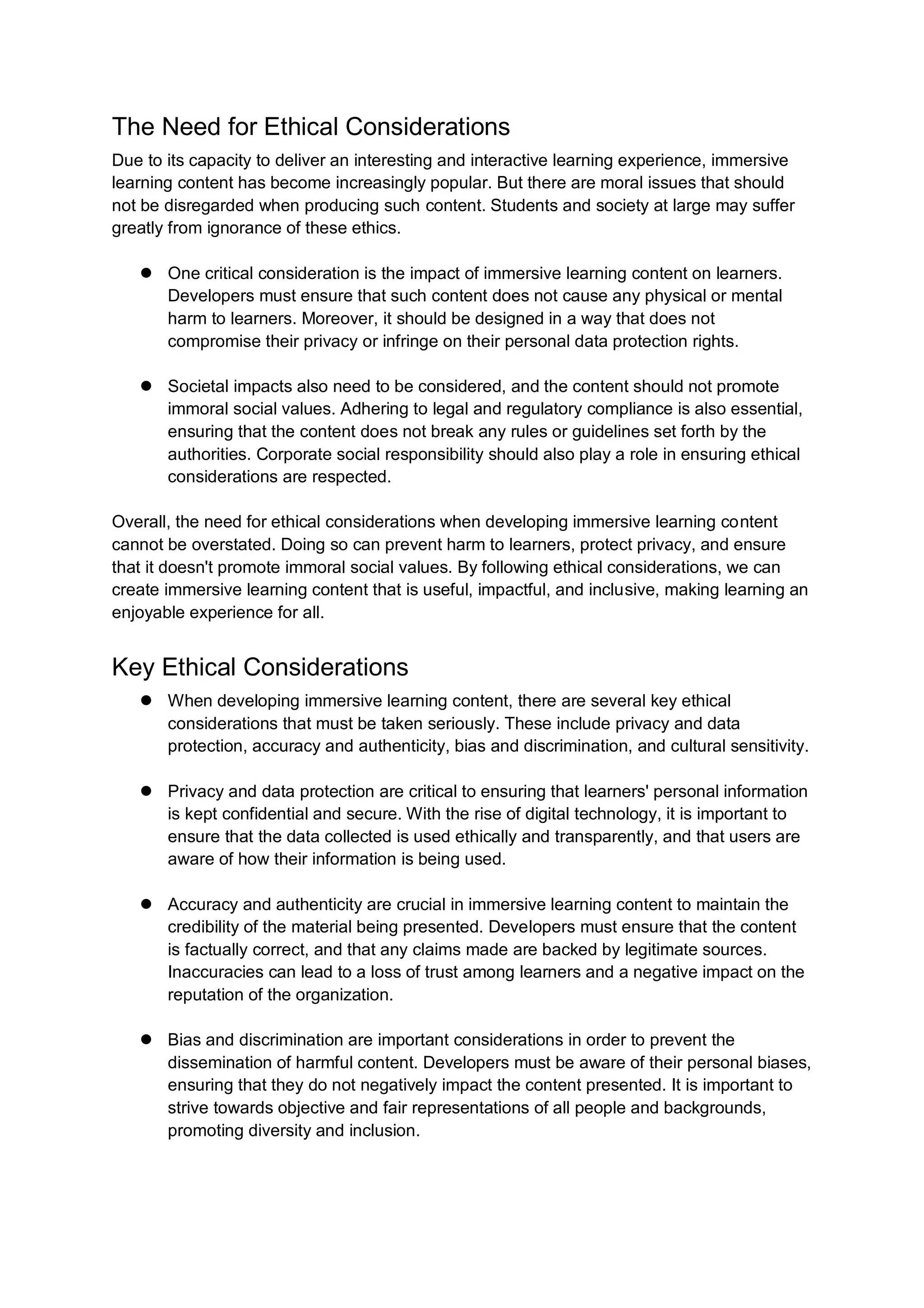 The document emphasizes the importance of ethical considerations in developing immersive learning content, which includes virtual reality and gamified experiences. Key issues such as privacy, data protection, accuracy, bias, and cultural sensitivity are highlighted as essential to ensure that the content is engaging without causing harm or promoting immoral values. Incorporating these ethics throughout the design process can enhance the quality and inclusivity of learning experiences.
