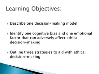 The document outlines a decision-making model for ethical considerations in psychology, emphasizing the importance of understanding both cognitive biases and emotional factors that can affect judgment. It discusses the complexity of ethical decision-making, highlighting foundational principles, competition between ethics, and the need for psychologists to be aware of personal biases and the dynamics of patient relationships. Strategies for improving ethical decision-making through structured frameworks and continual self-reflection are also presented.