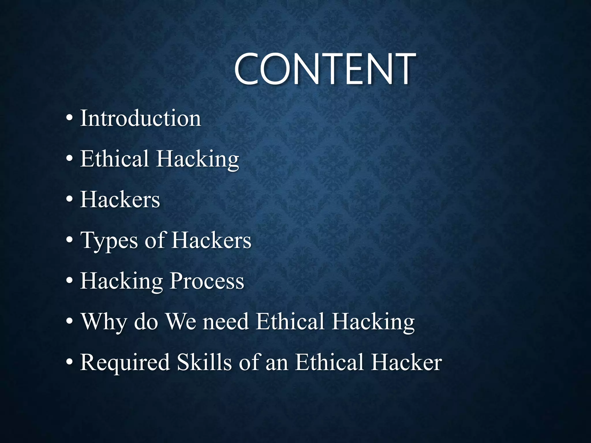 This document discusses ethical hacking and provides an overview of key concepts. It defines ethical hacking as legally breaking into computer systems to test defenses without damaging systems or stealing information. It describes different types of hackers including black hat, white hat, and grey hat hackers. The document outlines the hacking process and required skills of an ethical hacker such as knowledge of operating systems, firewalls, and networking protocols. It discusses why ethical hacking is important to protect against external attacks and close security vulnerabilities.