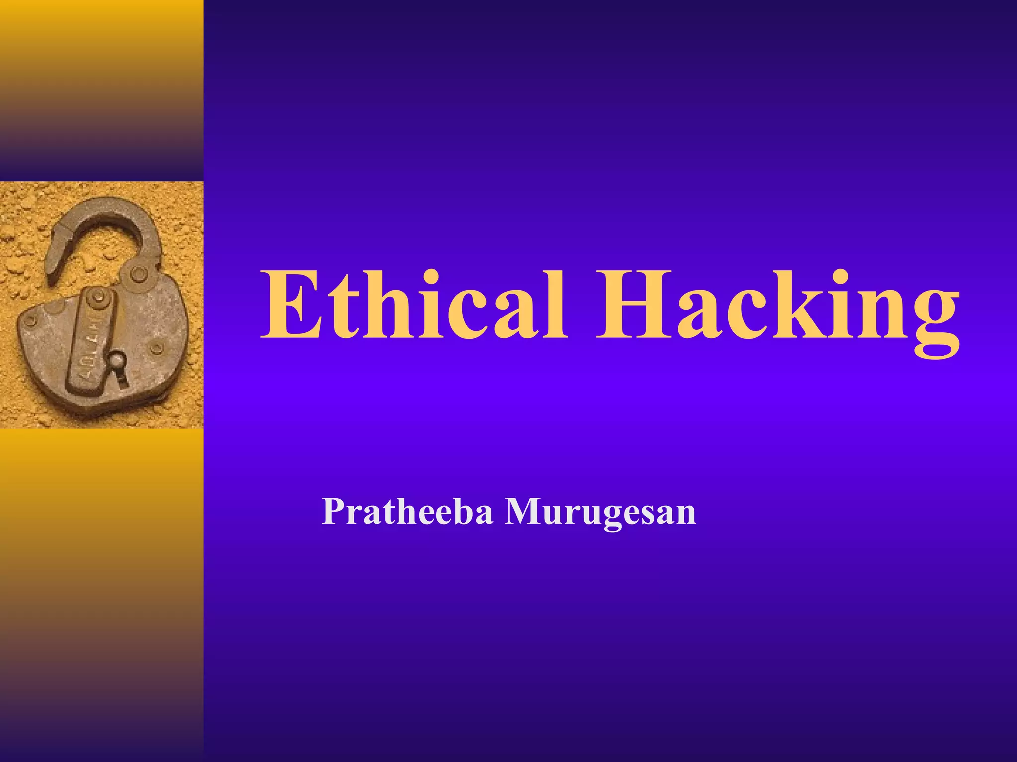 Ethical hacking involves security professionals evaluating target systems to identify vulnerabilities without damaging systems or stealing information. Ethical hackers have strong technical skills and work to find weaknesses in a system by using techniques similar to criminal hackers but for evaluation purposes only. A key document provides a security evaluation plan outlining what will be tested, limitations, and making clients aware of risks to get an agreement or "get out of jail free card" for the testing. The final report details all discoveries and specific advice for closing vulnerabilities without revealing the testers' techniques.